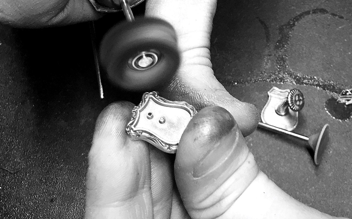 В изделиях используем гравировку, обьемные накладки в виде букв, эмаль, драгоценные и полудрагоценные камни